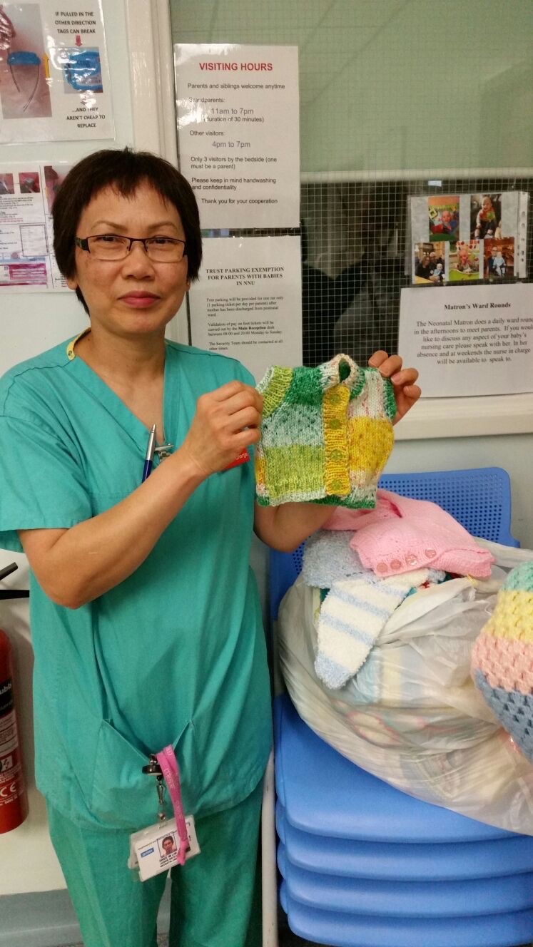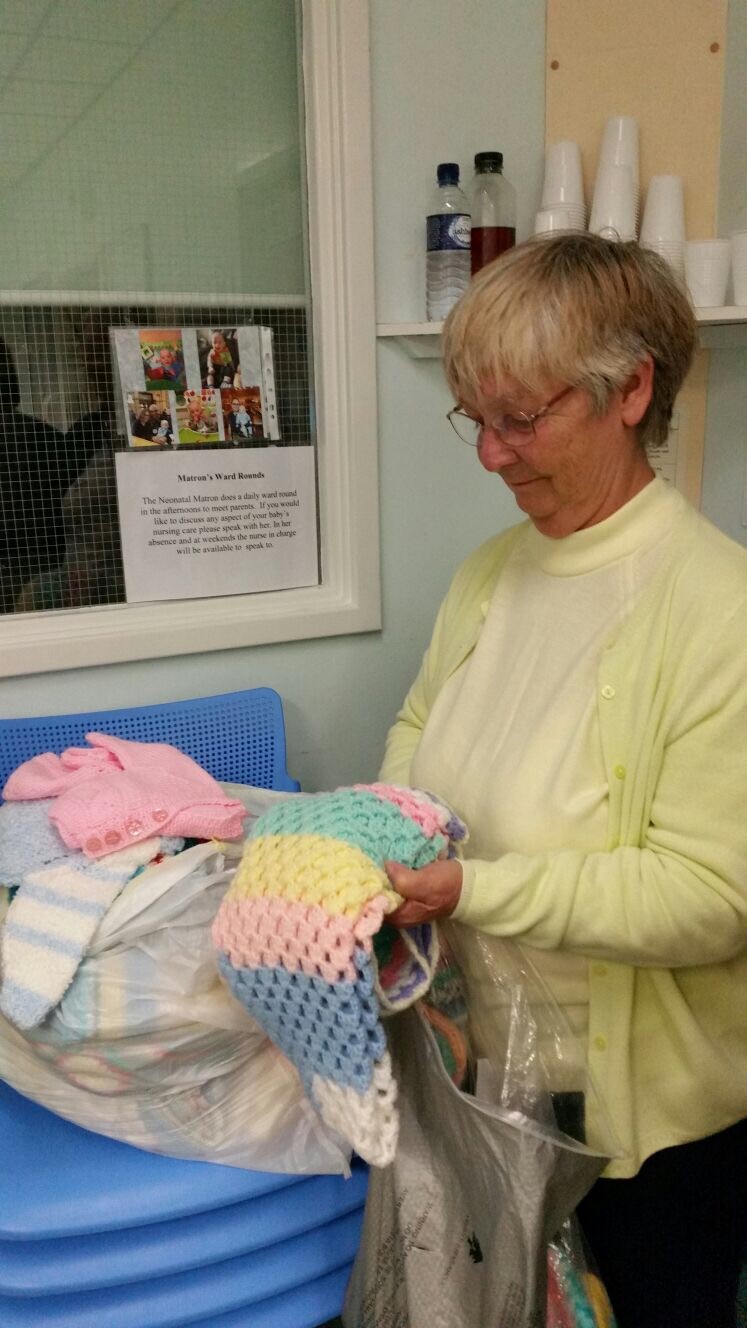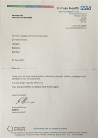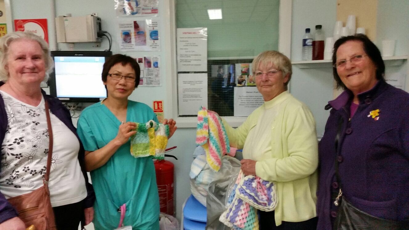 These pictures were taken in the Neonatal Unit at Wexham Park Hospital where we were able to presennt them with quite a number of items that had been knitted especially for premature babies by our members at the knitting club. Members present. were Glynys, Daphne, Helen and Angela |